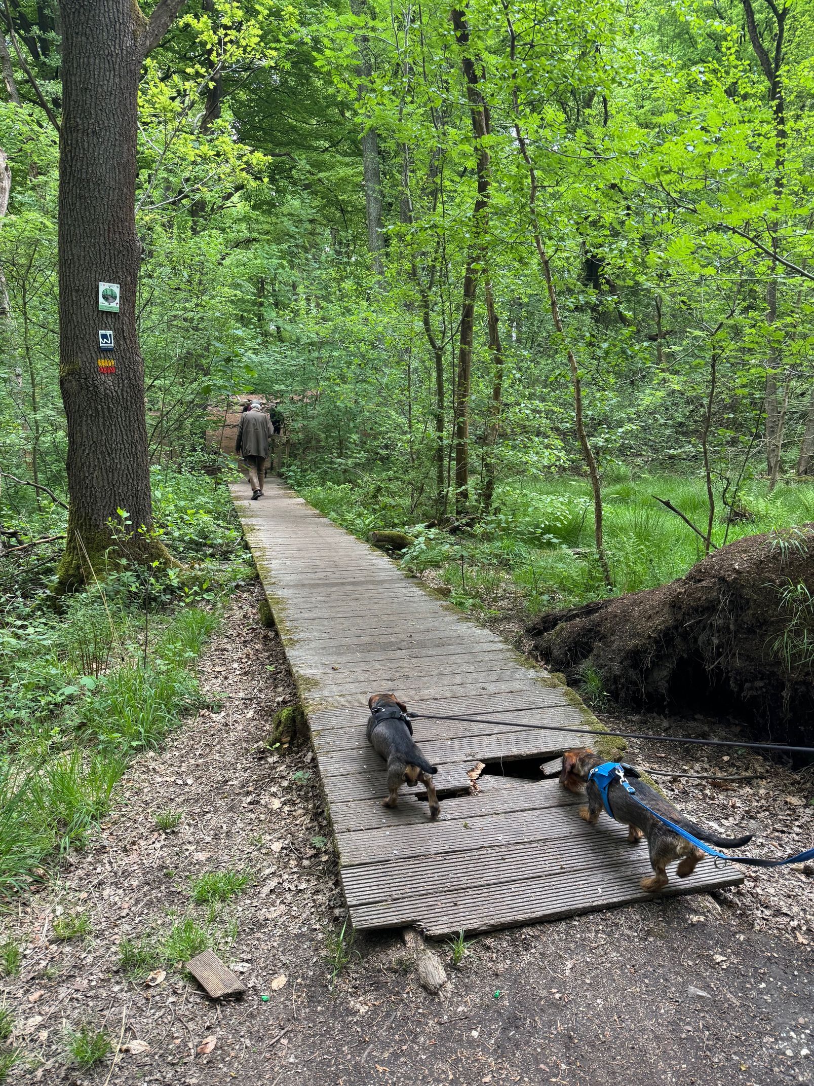 Wir machten eine wunderschöne Wanderung entlang der Schwalm, wo es auch einen flachen Zugang zum Wasser gab, der sich ideal zum Planschen für die Hunde eignete. Das Angebot wurde teils begeistert und teils noch vorsichtig angenommen. Es ist immer wieder schön, mit so vielen Dackeln unterwegs zu sein. Die fallen einfach auf und zaubern den Menschen immer ein Lächeln ins Gesicht.